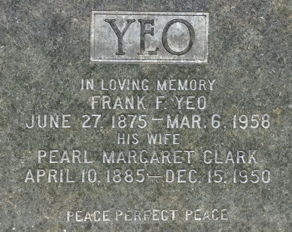 - [S8449] Cemetery marker. Frank F. Yeo & Pearl Margaret Clark, tombstone inscription; read by David A. Walker, 1 July 2013.