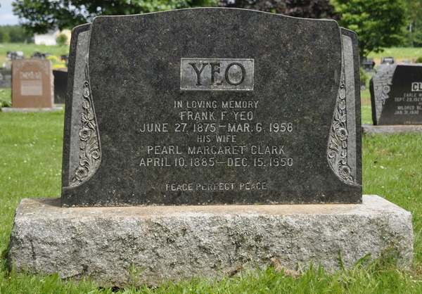 | Burial | She was buried in the Peoples Cemetery, Summerside, Prince County, Prince Edward Island, Canada, 46.40480, -63.77591G. Inscription: YEO / In Loving Memory / Frank F. Yeo / June 27, 1875 - Mar. 6, 1958 / His Wife / Pearl Margaret Clark / April 10, 1885 - Dec. 10, 1950 / Peace Perfect Peace.1,7 Tombstone, Frank F. Yeo (1875-1958) & Pearl Margaret Clark (1885-1950). Peoples Cemetery, Summerside, Prince County, Prince Edward Island, Canada.  Inscription detail. |