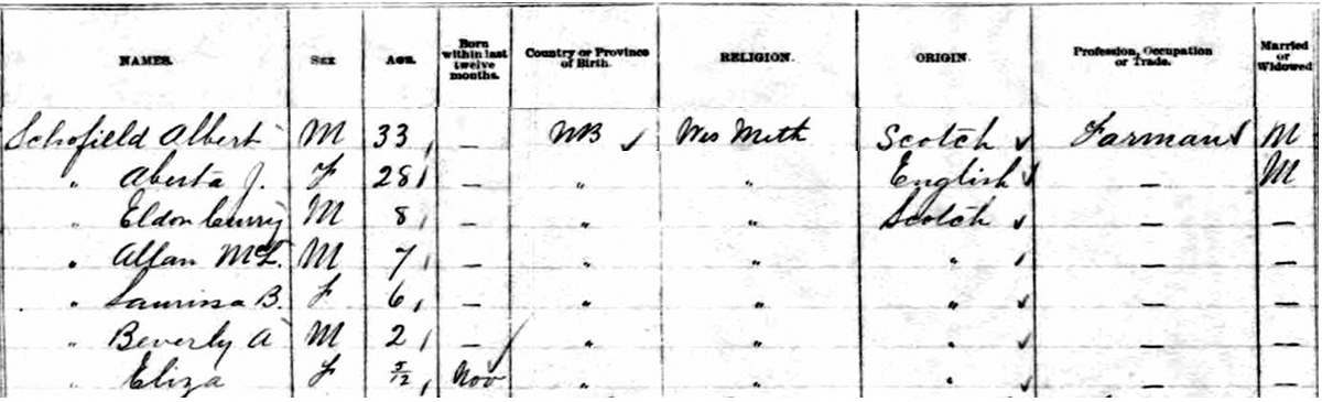 | Witness | He was enumerated on the census in 1881 in the household of Stephen Albert Schofield in Studholm, Kings County, New Brunswick, CanadaG. included in the household with Albert (age 33) were his wife Alberta Spicer (age 28), their children Eldon (age 8), Allan (age 7), Laurissa (age 6), Beverly (age 2) and Eliza (age 5 months). Albert was a farmer. Eldon, Allan and Laurissa were in school. The family religion was Wesleyan Methodist.1 1881 Canada Census, Studholm Parish, Kings County, New Brunswick. Household of Albert Schofield, his wife Alberta Spicer, their children Eldon, Allan, Laurissa, Beverly and Eliza. |