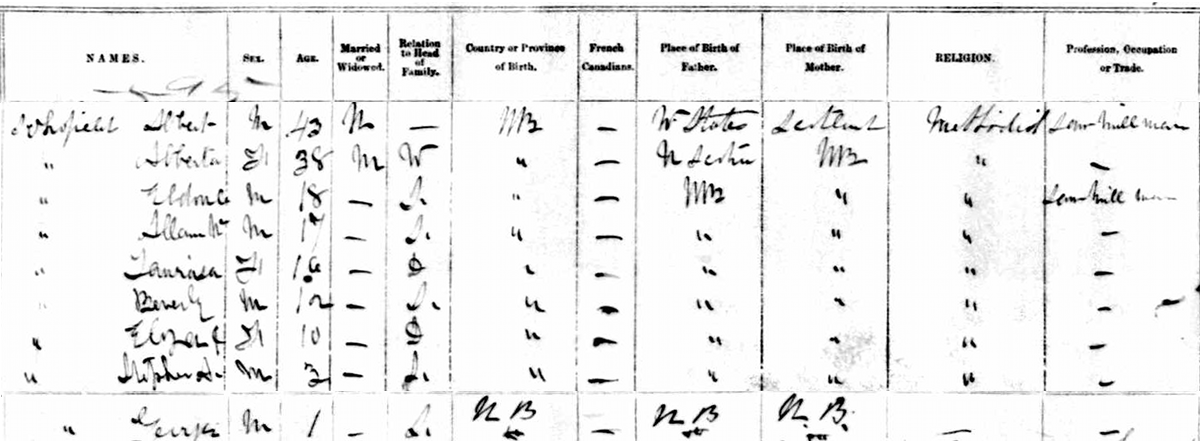 - [S8219] 1881 Canada Census, Studholm, Kings County, New Brunswick, household #101, of Albert Schofield, 1881, on-line digitial copy from microfilm, LAC reels C_13180, page 25. Library & Archives Canada, Library & Archives Canada; 395 Wellington St., Ottawa,, Ontario, Canada.