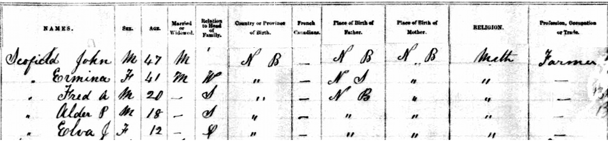 | Census | John Schofield was head of the household in the census on 16 April 1891 in Studholm Parish, Kings County, New Brunswick, CanadaG. included in the household with John (age 47) were his wife Ermina Spicer (age 41), their children Fred (age 20), Alder (age 18) and Elva (age 12). John was a farmer. The family religion was Methodist.3 1891 Canada Census, Studholm Parish, Kings County, New Brunswick. Household of John Schofield, his wife Ermina Spicer, their children Fred, Alder and Elva. |