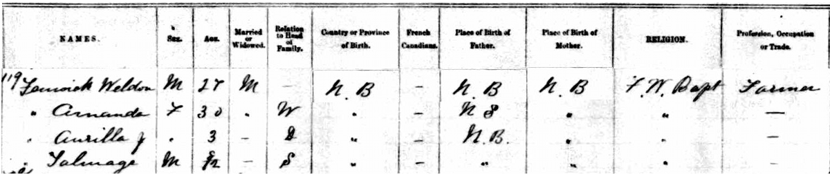 | Witness | He was enumerated on the census on 24 April 1891 in the household of Weldon Foster Fenwick in Studholm Parish, Kings County, New Brunswick, CanadaG. included in the household with Weldon (age 27) were his wife Amanda Spicer (age 30), their children Aurilla (age 3) and Talmage (age 8 months). Weldon was a farmer. The family religion was Free Will Baptist.1 1891 Canada Census, Studholm Parish, Kings County, New Brunswick. Household of Weldon Fenwick, his wife Amanda Spicer, their children Aurilla and Talmage. |