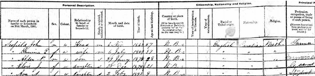 | Census | He was head of the household in the census in 1901 in Studholm Parish, Kings County, New Brunswick, CanadaG. included in the household with John (age 57) were his wife Ermina Spicer (age 51), their children Alder (age 28), Elva (age 21) and Eva (age 9). John was a farmer. The family religion was Methodist.2 1901 Canada Census, Studholm Parish, Kings County, New Brunswick. Household of John Schofield, his wife Ermina Spicer, their children Alder, Elva and Ava. |