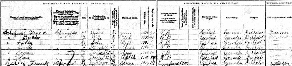 | Census | He was head of the household in the census in 1911 in Springfield, Kings County, New Brunswick, CanadaG. included in the household with Fred (age 41) were his wife Bertha MaGee (age 41), their children Hedley (age 5), Clara (age 3), Burris (age 2) and Edna (age 1). Fred was a farmer. The family religion was Methodist.3 1911 Canada Census, Sringfield, Kings County, New Brunswick. Household of Fred Schofield, his wife Bertha MaGee, their children Hedley, Clara, Burris & Edna. |