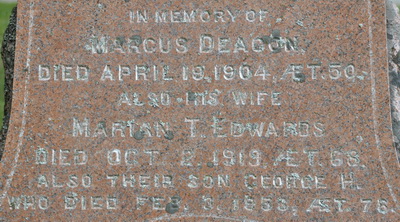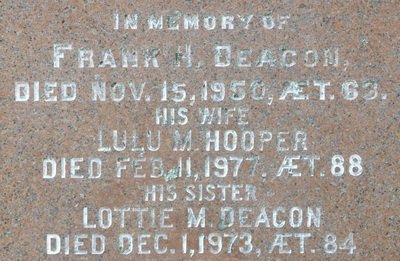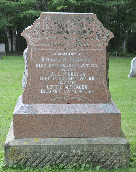 | Burial | He was buried in Methodist/United Cemetery, Freetown, Prince County, Prince Edward Island, Canada, 46.37344, -63.62326G. Inscription: In Memory of / Frank H. Deacon / Died Nov. 15, 1950, ÆT. 63. / His Wife / Lulu M. Hooper / Died Feb. 11, 1977, ÆT. 88 / His sister / Lottie M. Deacon / Died Dec. 1, 1973, ÆT. 84Back: In Memory of / Marcus Deacon / Died April 19, 1904, ÆT. 50 / Also his wife / Marian T. Edwards / Died Oct. 2, 1919, ÆT. 68 / Also their son George H. / Who died Feb 3, 1953, ÆT. 76.3,1 Tombstone, Frank H. Deacon (1886-1950), his wife Lulu M. Hooper (1889-1977), his sister Lottie M. Deacon (1889-1973), his father Marcus Deacon (1854-1904), his wife Marian T. Edwards (1851-1919), their son George H. Deacon (1877-1953). United Church Cemetery, Freetown, Prince County, Prince Edward Island, Canada.  Front inscription detail.  Back inscription detail. |
