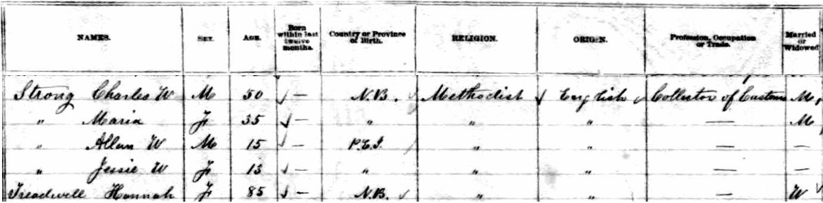 | Census | He was head of the household in the census (12 & 15 April 1901) in Lot 17, Prince County, Prince Edward Island, CanadaG. included in the household with Hubert (age 69) were his wife Mary Thomas (age 65), their daughter Eleanor Rebecca 'Nellie' (age 22), their son Stanley (age 34), his wife Minnie Cannon (age 29), their children Helen (age 13), May (age 11) & Preston (age 1). Also in the household were two unrelated people, John Poirier, a servant) and Mary Wedge, a domestic. Hubert was a farmer. The family religion was Church of England.6 1901 Canada Census, Lot 17, Prince County, Prince Edward Island. Household of Hubert George Compton, his wife Mary Pope Thomas, their daughter Eleanor Rebecca 'Nellie', their son Stanley, his wife Minnie Cannon, their children Helen, May & Preston, and two unrelated servants. |