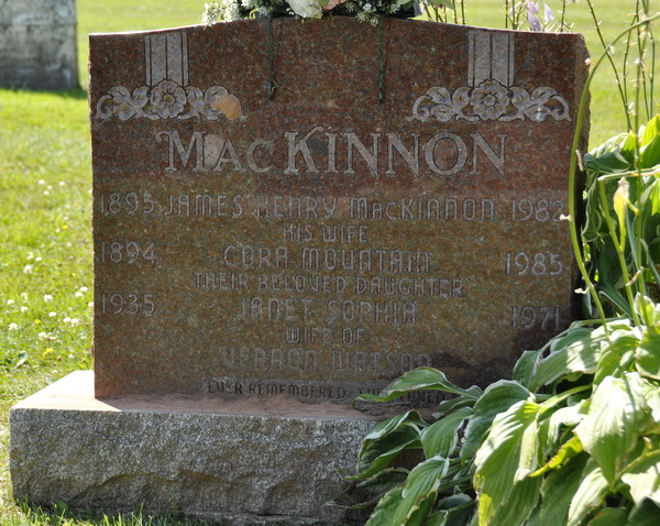 | Burial | He was buried in the Peoples Cemetery, Malpeque, Prince County, Prince Edward Island, Canada, 46.53030, -63.68741G. Inscription: MACKINNON / 1895 James Henry MacKinnon 1982 / His Wife / 1894 Cora Mountain 1985 / Their beloved daughter / 1935 Janet Sophia 1971 / Wife of / Vernon Watson / Ever Remembered, Ever Loved.1 Tombstone, James Henry MacKinnon (1895-1982), his wife Cora Mountain (1894-1985), their daughter Janet Sophia (1935-1971). Peoples Cemetery, Malpeque, Prince County, Prince Edward Island, Canada. |