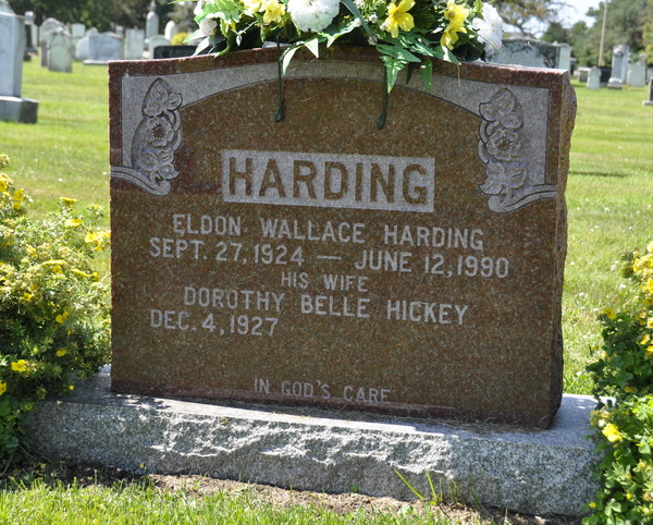 | Burial | He was buried in the Peoples Cemetery, Malpeque, Prince County, Prince Edward Island, Canada, 46.53041, -63.68652G. Section B, Row 3, #260.Inscription: HARDING / Eldon Wallace Harding / Sept. 27, 1924 - June 12, 1990 / His Wife / Dorothy Belle Hickey / Dec. 4, 1927 - / In God's CareBack: HARDING, fishing boat.1,2 Tombstone, Eldon Wallace Harding (1924-1990), his wife Dorothy Belle Hickey (1927- ). Peoples Cemetery, Malpeque, Prince County, Prince Edward Island, Canada. |