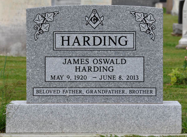 Inscription: HARDING / James Oswald / Harding / May 9, 1920 - June 8, 2013 / Beloved Father, Grandfather, Brother.4  Tombstone, James Oswald Harding (1920-2013). Peoples Cemetery, Malpeque, Prince County, Prince Edward Island, Canada.