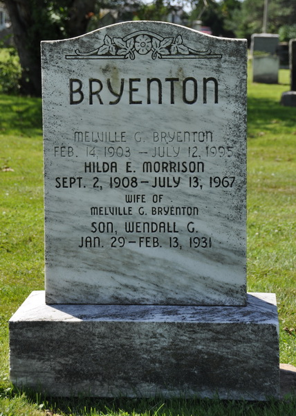 | Burial | He was buried in the Peoples Cemetery, Malpeque, Prince County, Prince Edward Island, Canada, 46.53025, -63.68692G. BRYENTON / Melville G. Bryenton / Feb. 14, 1903 - July 12, 1995 / Hilda E. Morrison / Sept. 2, 1908 - July 13, 1967 / Wife of / Melville G. Bryenton / Son Wendall G. / Jan. 29 - Feb. 13, 1931.1 Tombstone, Melville G. Bryenton (1903-1995), his wife Hilda E. Morrison (1908-1967), their son Wendall G. (1931-1931). Peoples Cemetery, Malpeque, Prince County, Prince Edward Island, Canada. |