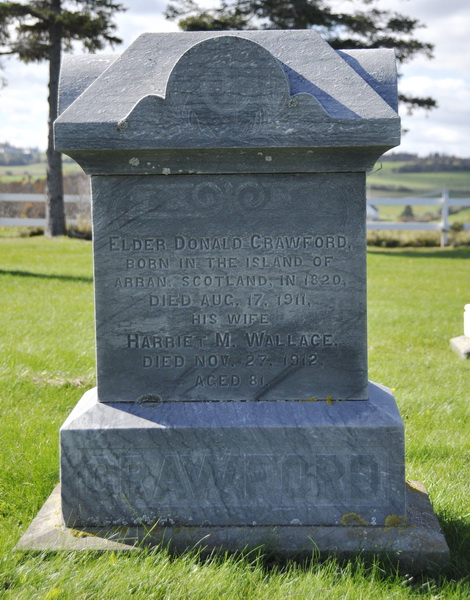 | Burial | She was buried in New Glasgow Cemetery; Cemetery Road, New Glasgow, Queens County, Prince Edward Island, Canada, 46.42411, -63.32824G. Elder Donald Crawford / Born in the Island of / Arran, Scotland, in 1820, / Died Aug. 17, 1911, / His Wife / Harriet M. Wallace, / Died Nov. 27, 1912, / Aged 81.1 Tombstone, Elder Donald Crawford (1820-1911), his wife Harriet M. Wallace (1831-1912). New Glasgow Cemetery, Queens County, Prince Edward Island, Canada. |