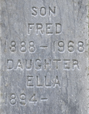 Inscription: JOHNSTON / E. W. Johnston / 1863 - 1936 / His Wife / Ida Belle Culleton / 1878 - 1935 / Sons / Allen Kimball 1878 - 1923 / Infant / Gone But Not ForgottenBack: JOHNSTON / Frederick Johnston / 1914 - 1991 / His Wife / Marjorie B. Stewart / 1919 - 1973 / Edgar Roy Johnston / 1924 - 1991Footstone: JOHNSTON / Edgar Roy / 1924 - 1991Footstone: Baby Johnston.1  Tombstone, Edward William Johnston (1863-1936), his first wife Ida Belle Culleton (1878-1935), their sons Allen Kimball (1898-1923), Infant (no dates), Edgar Roy (1924-1991), Frederick (1914-1991), his wife Marjorie B. Stewart (1919-1973). Nazarene & United Cemetery, Elmsdale, Prince County, Prince Edward Island, Canada.  Inscription detail.  Back inscription detail.  Footstone, Edgar Roy Johnston.  Footstone, Baby Johnston, son of Edward William Johnston & Ida Belle Culleton.
