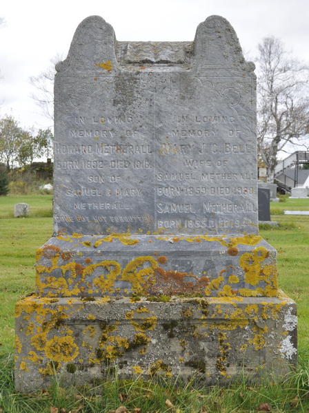 | Burial | She was buried in North Bedeque Cemetery, Prince County, Prince Edward Island, Canada, 46.36147, -63.72606G. Inscription: In / Memory of / Nathan McFarlane / Died / Jan. 1, 1886, / Æt. 80 / Also his wife / Margaret Silliker / Died / May 14, 1869, / Æt. 72 / McFARLANELeft: Muriel Alice / Daughter of / Charles & Margaret / E. McFarlane / Died Dec. 24, 1892 / Aged 8 months & / 13 daysRight: Charles C. McFarlane / Died / Oct. 14, 1909 / Also His Wife / Margaret E. Waugh / Died / Oct. 17, 1909 / Æt. 49.1 Tombstone, Nathan McFarlane (1805-1886), his wife Margaret Silliker (1797-1869), their son Charles (1850-1909), his wife Margaret E. Waugh (1860-1909), their daughter Muriel Alice (1892-1892). North Bedeque Cemetery, Prince County, Prince Edward Island, Canada.  Front inscription detail.  Left inscription detail.  Right inscription detail. |