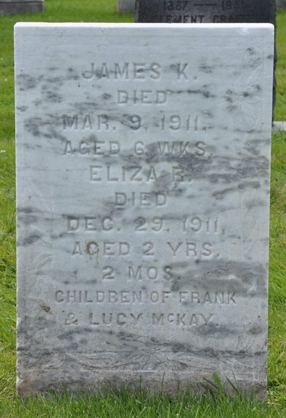 | Burial | He was buried in the Peoples Cemetery, Malpeque, Prince County, Prince Edward Island, Canada, 46.52980, -63.68683G. Inscription: James K. / Died / Mar. 9, 1911 / Aged 6 wks. / Eliza B. / Died / Dec. 29, 1911 / Aged 2 yrs, / 2 mos. / children of Frank / & Lucy McKay.1 Tombstone, James K. McKay (1911-1911), his sister Eliza B. McKay (1909-1911). Peoples Cemetery, Malpeque, Prince County, Prince Edward Island, Canada. |