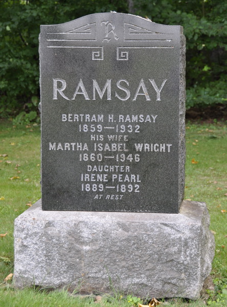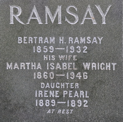 Inscription: RAMSAY / Bertram H. Ramsay / 1859 - 1932 / His Wife / Martha Isabel Wright / 1860 - 1946 / Daughter / Irene Pearl / 1889 - 1892 / At Rest.1,4  Tombstone, Bertram Ramsay (1859-1932), his wife Martha Isabel Wright (1860-1946), their daughter Irene Pearl (1889-1892). United Church Cemetery, Montrose, Prince County, Prince Edward Island.  Front inscription detail.