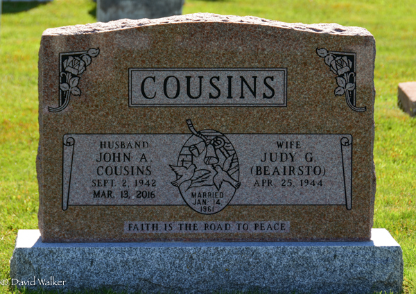 Inscription: COUSINS / Husband / John A. / Cousins / Sept. 2, 1942 / Mar. 13, 2016 | Married / Jan. 14, 1961 | Wife / Judy G. / (Beairsto) / Apr. 25, 1944 // Faith is the road to peace.2,4  Tombstone, John A. Cousins (1942-2016), his wife Judy G. Beairsto (1944- ). Peoples Cemetery, Malpeque, Prince County, Prince Edward Island, Canada.