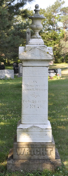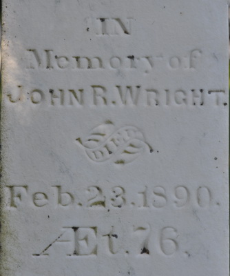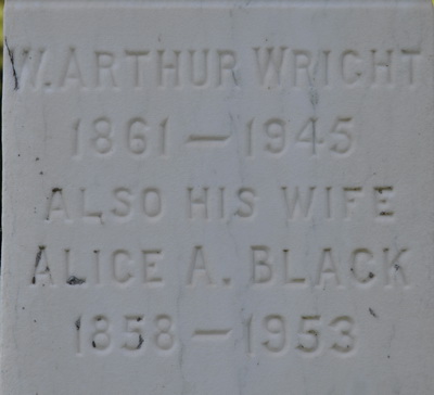 Inscription: In / Memory of / John R. Wright / Died / Feb. 23, 1890. / Æt. 76. / WrightLeft: His Wife / Sophia / Died / July 3, 1898, / Æt. 79Right: W. Arthur Wright / 1861 - 1945 / Also His Wife / Alice A. Black / 1858 - 1953.2,5  Tombstone, John Robins Wright (1814-1890), his wife Sophia Ann Craig (1819-1898), their son William Arthur Wright (1861-1945), his wife Alice A. Black (1858-1953). United Church Cemetery, Searletown, Prince County, Prince Edward Island, Canada.  Front inscription detail.  Left inscription detail.  Right inscription detail.