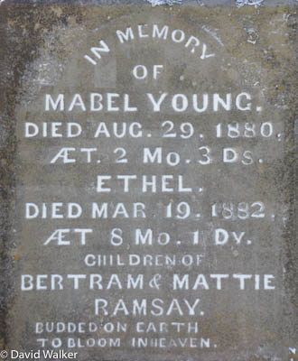 Inscription: In memory / of / Mabel Young / Died Aug. 29, 1880, / ÆT 2 Mo. 3 Ds. / Ethel / Died Mar. 19, 1882, / ÆT 8 Mo. 1 Dy. / Children of / Bertram & Mattie / Ramsay / Budded on Earth / To bloom in Heaven.3,2  Tombstone, Mabel Young Ramsay (1880-1880), her sister Ethel (1881-1882). Old Dock Cemetery, Alberton, Prince County, Prince Edward Island, Canada.  Front inscription.