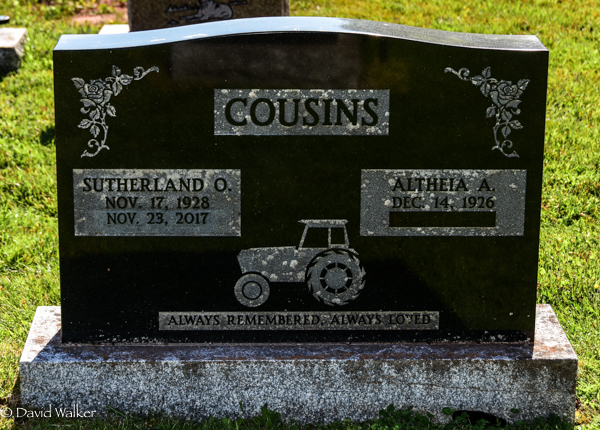 Inscription: COUSINS / Sutherland O. / Nov. 17, 1928 / Nov. 23, 2017 | Altheia A. / Dec. 14, 1926 / Always Remembered, Alway Loved.2,5  Tombstone, Sutherland O. Cousins (1928-2017), his wife Altheia A. Bryanton (1926- ). Peoples Cemetery, Malpeque, Prince County, Prince Edward Island, Canada.