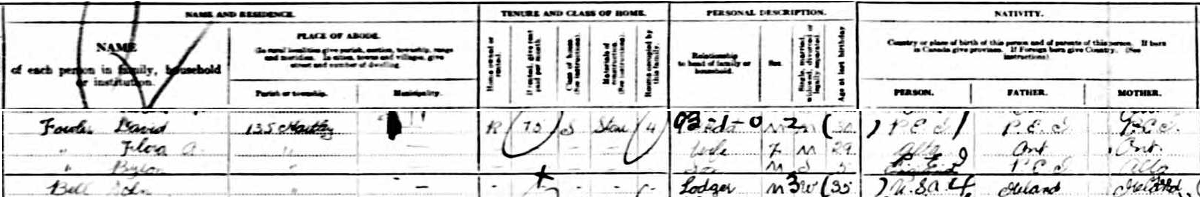 | Witness | He was enumerated on the census in 1921 in the household of David Rogers Fowler in 135 Hartley St., Brockville, Leeds County, Ontario, CanadaG. included in the household with David (age 30) were his wife Flora Stewart (age 29), their son Byron (age 5) and a lodger named John Bell. David was a sales manager. He was Methodist, Flora and Byron were Presbyterian.1 1921 Canada Census, Brockville, Leeds County, Ontario. Household of David Rogers Fowler, his wife Flora MacCrea Stewart, their son Byron. Image courtesy of Library & Archives Canada. |