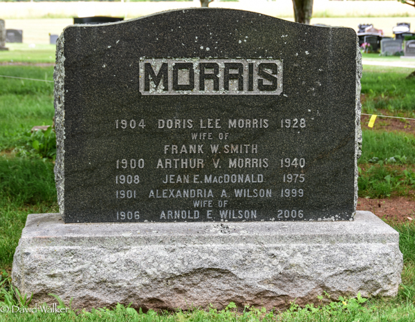 Inscription: MORRIS / 1876 Cyrus B. Morris 1955 / 1874 Florence I. Mills 1949 / Wife of / Cyrus B. MorrisBack: MORRIS / 1904 Doris Lee Morris 1928 / Wife of / Frank W. Smith / 1900 Arthur V. Morris 1940 / 1908 Jean E. MacDonald 1975 / 1901 Alexandria A. Wilson 1999 / Wife of / 1906 Arnold E. Wilson 2006Flatstones: Father | Mother | Doris | Arthur.2,6  Tombstone, Cyrus B. Morris (1876-1955), his wife Florence I. Mills (1874-1949), their children Doris Lee Morris (1904-1928), Arthur Morris(1900-1940), Jean Morris (1908-1975), Alexandria Morris (1901-1999), her husband Arnold E. Wilson (1906-2006). Peoples Cemetery, Summerside, Prince County, Prince Edward Island, Canada.  Back inscription detail.