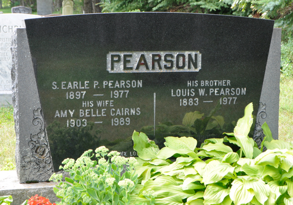 | Burial | He was buried in the United Church Cemetery, Searletown, Prince County, Prince Edward Island, Canada, 46.30293, -63.68999G. PEARSON / S. Earle P. Pearson / 1897 - 1977 / His Wife / Amy Belle Cairns / 1903 - 1989 | His Brother / Louis W. Pearson / 1883 - 1977.2 Tombstone, S. Earle P. Pearson (1897-1977), his wife Amy Belle Cairns (1903-1989), his brother Louis W. Pearson (1883-1977). United Church Cemetery, Searletown, Prince County, Prince Edward Island, Canada. |