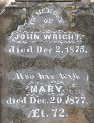 | Burial | He was buried in the United Church Cemetery, Searletown, Prince County, Prince Edward Island, Canada, 46.30290, -63.69026G. Inscription: WRIGHT / In Memory / of / John Wright / died Dec. 2, 1875, / Æt. 86 / Also His Wife / Mary / died Dec. 20, 1877, / Æt. 72Left: In Memory / of / Annie Amelia / died Nov. 13, 1875, /Æt. 12. / Daughter of / Dugald S. & Beria / S. Wright.Back: Emma Huestis / Born Feb. 1856 / Died June 1920.5 Tombstone, John Wright (1789-1875), his second wife Mary Stewart (1805-1877), Annie Amelia (1863-1875), daughter of their son Dugald Wright & Beria Black, Emma Huestis (1856-1920), daughter of their daughter Elizabeth Ann Wright & Nathaniel Wright Huestis. United Church Cemetery, Searletown, Prince County, Prince Edward Island, Canada.  Front inscription detail.  Left inscription detail.  Back inscription detail. |