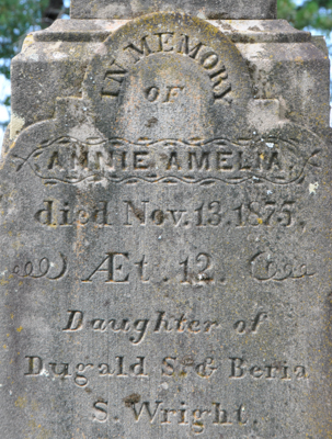 | Burial | She was buried in the United Church Cemetery, Searletown, Prince County, Prince Edward Island, Canada, 46.30290, -63.69026G. Inscription: WRIGHT / In Memory / of / John Wright / died Dec. 2, 1875, / Æt. 86 / Also His Wife / Mary / died Dec. 20, 1877, / Æt. 72Left: In Memory / of / Annie Amelia / died Nov. 13, 1875, /Æt. 12. / Daughter of / Dugald S. & Beria / S. Wright.Back: Emma Huestis / Born Feb. 1856 / Died June 1920.4 Tombstone, John Wright (1789-1875), his second wife Mary Stewart (1805-1877), Annie Amelia (1863-1875), daughter of their son Dugald Wright & Beria Black, Emma Huestis (1856-1920), daughter of their daughter Elizabeth Ann Wright & Nathaniel Wright Huestis. United Church Cemetery, Searletown, Prince County, Prince Edward Island, Canada.  Front inscription detail.  Left inscription detail.  Back inscription detail. |