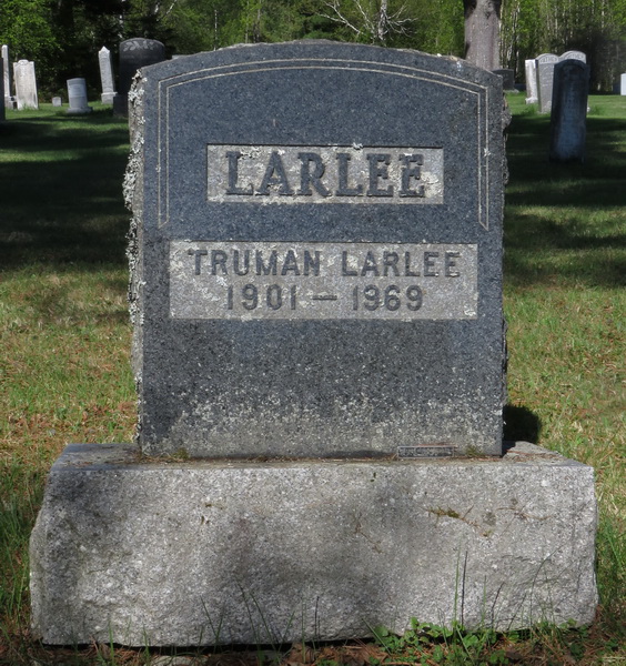 Inscription: LARLEE / Truman Larlee / 1901 - 1969.4  Tombstone, Truman Larlee (1901-1969). Larlee Creek Baptist Church Cemetery, Perth-Andover, Victoria County, New Brunswick, Canada.