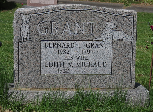 Inscription: GRANT / Bernard U. Grant / 1932 - 1999 / His Wife / Edith V. Michaud / 1932 -.3  Marker, Bernard U. Grant (1932-1999), his wife Edith V. Michaud (1932- ). Larlee Creek Cemetery, Perth-Andover, Victoria County, New Brunswick, Canada.