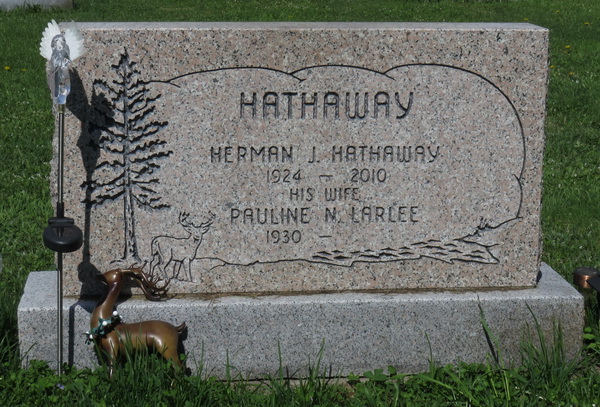 Inscription: HATHAWAY / 1924 - 2010 / His Wife / Pauline N. Larlee / 1930 -.2,3  Marker, Herman Hathaway (1924-2010), his wife Pauline N. Larlee (1930- ). Larlee Creek Cemetery, Victoria County, New Brunswick, Canada.