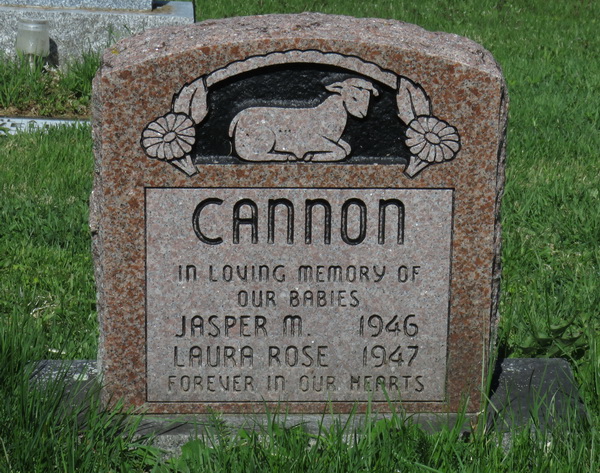 Inscription: CANNON / Our Babies / Jasper M. 1946 / Laura Rose 1947 / Forever in Our Hearts.1,2  Marker, Jasper M. Cannon (1946-1946) & Laura Rose Cannon (1947-1947), children of Thomas M. Cannon & Ruth Maria Larlee. Larlee Creek Cemetery, Victoria County, New Brunswick, Canada.