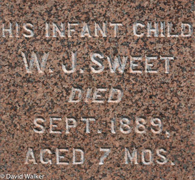 Inscription: Peace Perfect Peace / In Loving Memory of / Samuel M. Sweet / Born Dec. 9, 1849, / Died Oct. 15, 1918. / Also His Wife / Isabelle Murray / Born Oct. 19, 1865 / Died / Oct. 27, 1945Left: His infant child / W.J. Sweet / Died / Sept. 1889, / Aged 7 mos.8  Tombstone, Samuel M Sweet (1848-1918), his second wife Isabelle Murray (1865-1945), his infant child (1889-1889) by his first marriage. United Church Cemetery, Knutsford, Prince County, Prince Edward Island, Canada.  Left inscription.