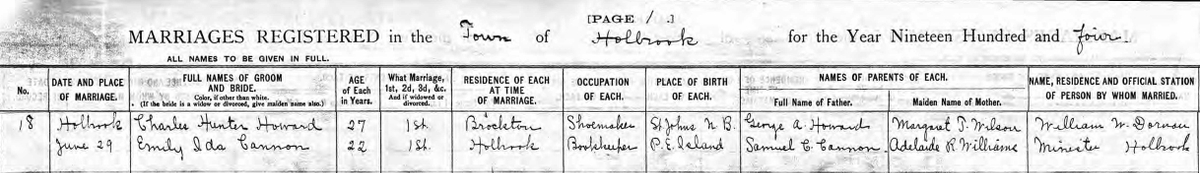 - [S9620] Charles Hunter Howard & Emily Ida Cannon, (29 June 1904), Massachusetts Marriage Records, 1840-1915, original data: Massachusetts Vital Records, 1911-1915. New England Historic Genealogical Society. Hereinafter cited as Massachusetts Marriage Records.
