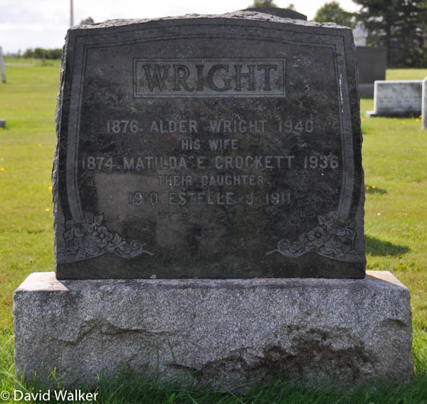 Inscription: WRIGHT / 1876 Alder Wright 1940 / His Wife / 1874 Matilda E. Crockett 1936 / Their Daughter / 1910 Estelle J. 1911.2,3  Tombstone, Alder Wright (1876-1940), his wife Matilda E. Crockett (1874-1936), their daughter Estelle (1910-1911). Church of Scotland Cemetery, Cape Traverse, Prince County, Prince Edward Island, Canada.
