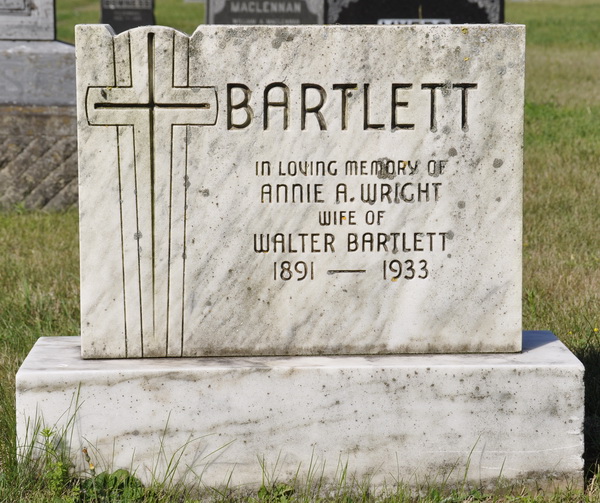 Inscription: BARTLETT / In Loving Memory of / Annie A. Wright / Wife of / Walter Bartlett / 1891 - 1933.2,5  Tombstone, Annie A. (Wright) Bartlett (1891-1933). United Church Cemetery, Searletown, Prince County, Prince Edward Island, Canada.