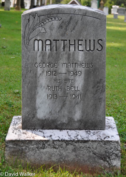 Inscription: MATTHEWS / George Matthews / 1912 - 1949 / His Wife / Ruth Bell / 1913 - 1941.2,3  Tombstone, George Matthews (1912-1949), his wife Ruth Bell (1913-1941). United Church Cemetery, Elmsdale, Prince County, Prince Edward Island, Canada.