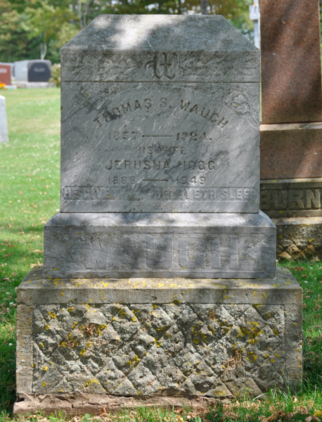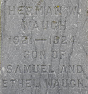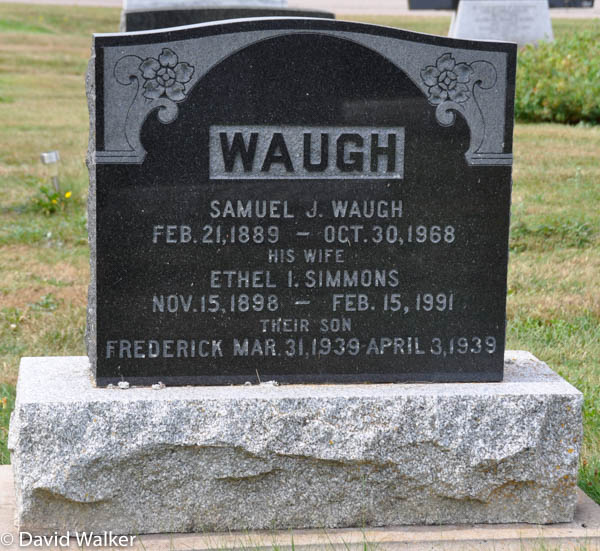 Inscription: WAUGH / Samuel J. Waugh / Feb. 21, 1889 - Oct. 30, 1968 / His Wife / Ethel I. Simmons / Nov. 15, 1898 - Feb. 15, 1991 / Their Son / Frederick Mar. 31, 1939 - April 3, 1939.1,3  Tombstone, Samuel J. Waugh (1889-1968), his wife Ethel I. Simmons (1898-1991), their son Frederick (1939-1939). Peoples Cemetery, Freetown, Prince County, Prince Edward Island, Canada.