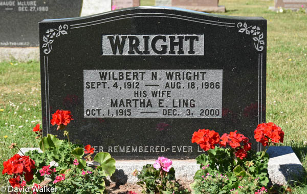 Inscription: WRIGHT / Wilbert N. Wright / Sept. 4, 1912 - Aug. 18, 1986 / His Wife / Martha E. Ling / Oct. 1, 1915 - Dec. 3, 2000 / Ever Remembered, Ever LovedBack: WRIGHT.2,4  Marker, Wilbert N. Wright (1912-1986), his wife Martha E. Ling (1915-2000). United Baptist Church Cemetery, Central Bedeque, Prince County, Prince Edward Island, Canada.