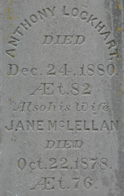 - [S10596] Tombstone, Peoples Cemetery, Malpeque, Prince County, Prince Edward Island, Canada. Anthony Lockhart & Jane McLellan, marker inscription; read by David A. Walker, 8 July 2015.