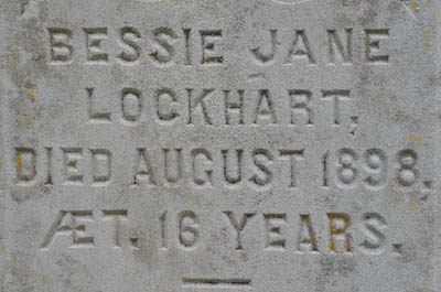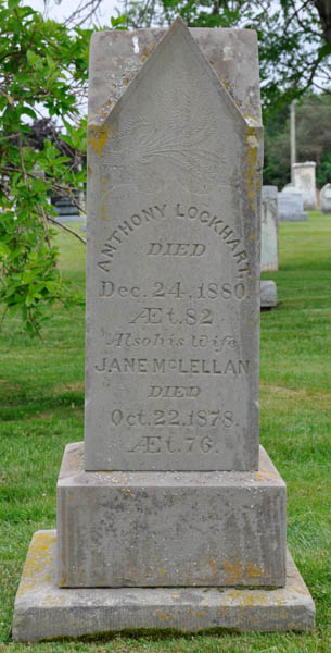 Inscription: Anthony Lockhart / Died / Dec. 24, 1880, / Æt. 82 / Also his Wife / Jane McLellan / Died / Oct. 22, 1878, / Æt. 76.Left: Bessie Jane / Lockhart / Died August 1898, / ÆT. 16 Years.1,3  Tombstone, Anthony Lockhart (1799-1880), his wife Jane McLellan (1802-1878), their granddaughter (daughter of son George Lockhart & Mary Adelaide Wallace) Bessie Jane Lockhart (1882-1898). Peoples Cemetery, Malpeque, Prince County, Prince Edward Island, Canada.  Front inscription.  Left inscription.