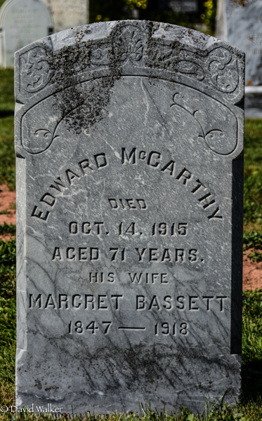 Inscription: Edward McCarthy / Died / Oct. 14, 1915 / Aged 71 Years. / His Wife / Margret Bassett / 1847 - 1918.2  Tombstone, Edward McCarthy (1844-1915), his wife Margret Bassett (1847-1918). Peoples Cemetery, Malpeque, Prince County, Prince Edward Island, Canada.