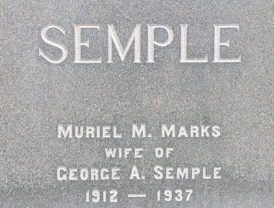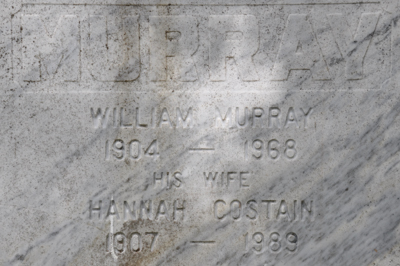 Inscription: In Loving Memory of / M. Joseline Thompson / Wife of / George Murray / Died Dec. 20, 1925, Aged 46 / Also of / George Murray / Died Sept. 3, 1938, Aged 70. / James Murray 1899 - 1949Back: MURRAY / William Murray / 1904 - 1968 / His Wife / Hannah Costain / 1907 - 1989.2  Tombstone, George Murray (1868-1938), his wife Joseline Thompson (1879-1925), their sons James (1899-1949) and William (1904-1968), his wife Hannah Costain (1907-1989). Woodlawn Cemetery, Alberton, Prince County, Prince Edward Island, Canada.  Front inscription detail.  Back inscription detail.