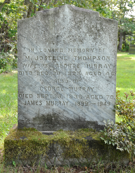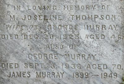 Inscription: In Loving Memory of / M. Joseline Thompson / Wife of / George Murray / Died Dec. 20, 1925, Aged 46 / Also of / George Murray / Died Sept. 3, 1938, Aged 70. / James Murray 1899 - 1949Back: MURRAY / William Murray / 1904 - 1968 / His Wife / Hannah Costain / 1907 - 1989.1  Tombstone, George Murray (1868-1938), his wife Joseline Thompson (1879-1925), their sons James (1899-1949) and William (1904-1968), his wife Hannah Costain (1907-1989). Woodlawn Cemetery, Alberton, Prince County, Prince Edward Island, Canada.  Front inscription detail.  Back inscription detail.
