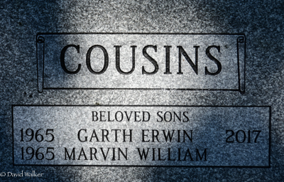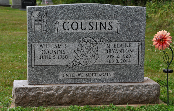 Inscription: COUSINS / Williams S. / Cousins / June 5, 1930 | Wed / Sept. 6 / 1950 | M. Elaine / Bryanton / Apr. 2, 1929 / Feb. 3, 2014 // Until We Meet AgainBack: COUSINS / Beloved Sons / 1965 Garth Erwin 2017 / 1965 Marvin William.1  Back inscription detail.  Tombstone, William S. Cousins (1930- ), his wife M. Elaine Bryanton (1929-2014), their sons Garth Erwin (1965-2017) and Marvin William (1965- ). Peoples Cemetery, Malpeque, Prince County, Prince Edward Island, Canada.