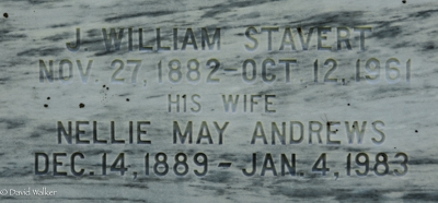 Inscription: William Stavert / Died / Oct. 10, 1906 / Aged 81 Years / Also His Wife / Catherine McMurdo / Died / July 5, 1924 / Aged 79 Years. / Blessed are the dead who die in the Lord.Back: J. William Stavert / Nov. 27, 1882 - Oct. 12, 1961 / His Wife / Nellie May Andrews / Dec. 14, 1889 - Jan. 4, 1983.4  Cemetery marker, William Stavert (1824-1906), his wife Catherine McMurdo (1851-1924), their son William (1882-1961), his wife Nellie May Andrews (1889-1983). Peoples Cemetery, Kensington, Prince County, Prince Edward Island, Canada.  Back inscription detail.