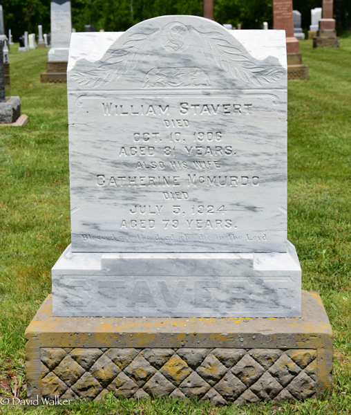 - [S13361] Cemetery marker, Peoples Cemetery, Kensington, Prince County, Prince Edward Island, Canada. William Stavert & Catherine McMurdo, tombstone inscription & photograph; documented by David A. Walker, 20 June 2018.