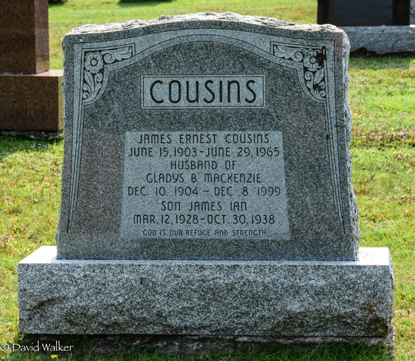 Inscription: COUSINS / James Ernest Cousins / June 15, 1903 - June 29, 1965 / Husband of Gladys B. MacKenzie / Dec. 10, 1904 - Dec. 8, 1999 / Son James Ian / Mar. 12, 1928 - Oct. 30, 1938 / God is our refuge and strength.4  Tombstone, James Ernest Cousins (1903-1965), husband of Gladys B. MacKenzie (1904-1999), their son James Ian (1928-1938). Presbyterian/United Cemetery, Hunter River, Queens County, Prince Edward Island, Canada.