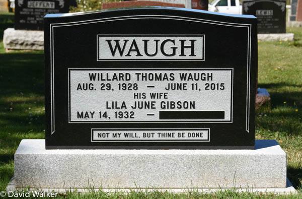 Inscription: WAUGH / Willard Thomas Waugh / Aug. 29, 1928 - June 11, 2015 / His Wife / Lila June Gibson / May 14, 1932 - / Not my will, but thine be doneBack: WAUGH.1,2  Marker, Willard Thomas Waugh (1928-2015), his wife Lila June Gibson (1932- ). United Baptist Church Cemetery, Central Bedeque, Prince County, Prince Edward Island, Canada.