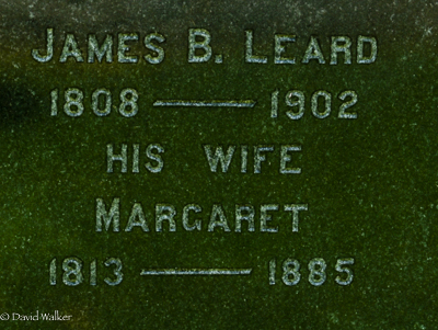 Back: James B. Leard / 1808 - 1902 / His Wife / Margaret / 1813 - 1885.2,3  Tombstone, John Albert Brace (1855-1938), his wife Margaret Eva Roberta (1855-1948), James B. Leard (1808-1902), his wife Margaret (1813-1885). Peoples Cemetery, Summerside, Prince County, Prince Edward Island, Canada.  Back inscription detail.